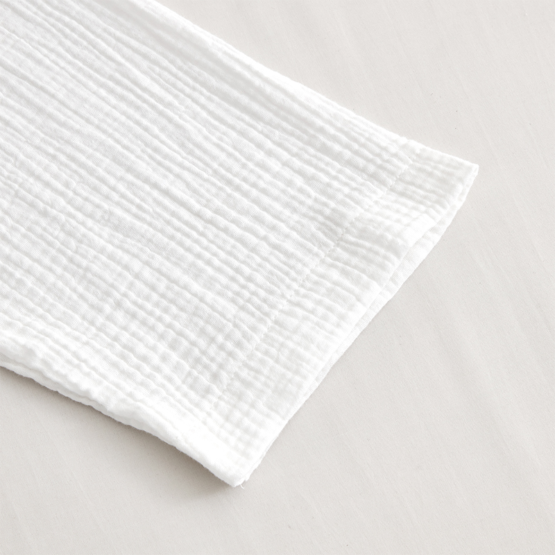 Jubah mandi kami diperbuat daripada kapas kasa dua lapis. Tenunan kasa yang unik dan longgar membolehkan aliran udara tanpa halangan antara dua lapisan, menghasilkan fabrik bernafas yang memastikan keselesaan dalam semua iklim dan mengelakkan terlalu panas. Sifat semula jadi kapas kasa ialah ia menjadi sangat lembut dari semasa ke semasa, menjadikan ia berasa licin seperti awan terhadap kulit. Walaupun pembinaan dua lapisan, fabrik tetap ringan. Ia menyerap secara semula jadi dan berkesan menghilangkan lembapan, menjadikan kulit berasa segar dan kering selepas mandi. Diperbuat daripada 100% gentian kapas semulajadi, kain kasa kami adalah hypoallergenic dan bebas daripada bahan kimia yang keras, menjadikannya sesuai untuk semua jenis kulit, termasuk kulit sensitif. Jahitan bertetulang pada semua jahitan dan kolar memastikan ketahanan jubah mandi dan keupayaan untuk menahan kesukaran penggunaan yang kerap dan pencucian komersial. Pinggang lebar yang direka sendiri dengan gelung yang diletakkan secara strategik memberikan kesesuaian yang selamat dan disesuaikan untuk semua jenis badan.